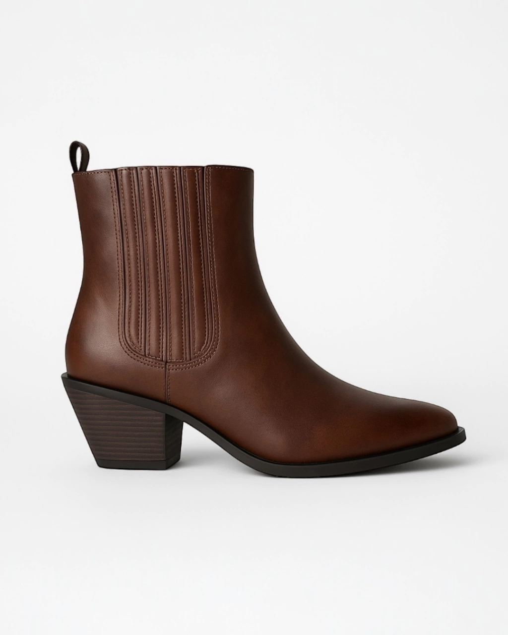 A bota vem com pegada western, confeccionada em material sintético de alta qualidade, bico fino e salto baixo bloco de 5cm. Possui recorte pespontado e cano curto com elástico, unindo estilo e praticidade. Com um toque sofisticado, garante conforto e versatilidade para compor looks estilo boho.