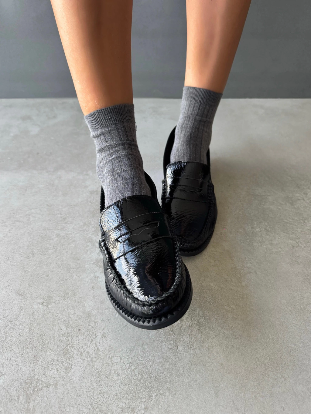 Mocassim preto de couro. Em verniz molhado com textura levemente enrugada. Possui formato arredondado na ponta e aplicação de tira vazada sobre o cabedal. Possui costura marcada no contorno da biqueira e franzido na parte frontal.