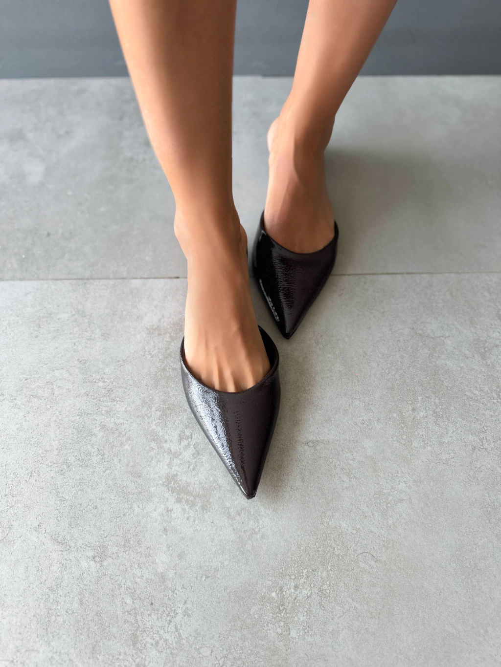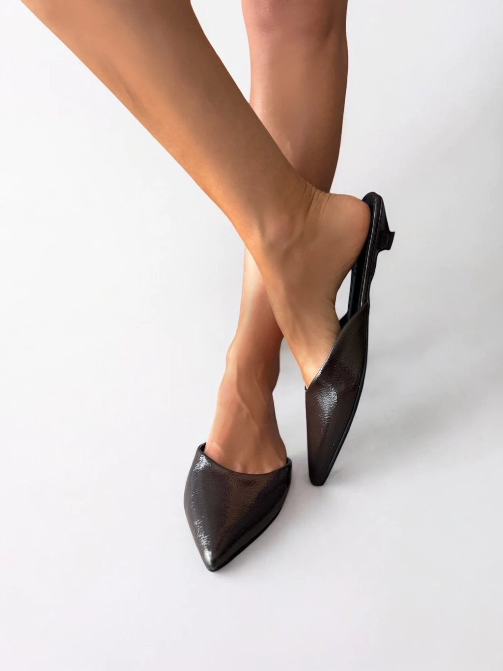 Mule Verniz Marrom Salto Baixo Bico Fino
