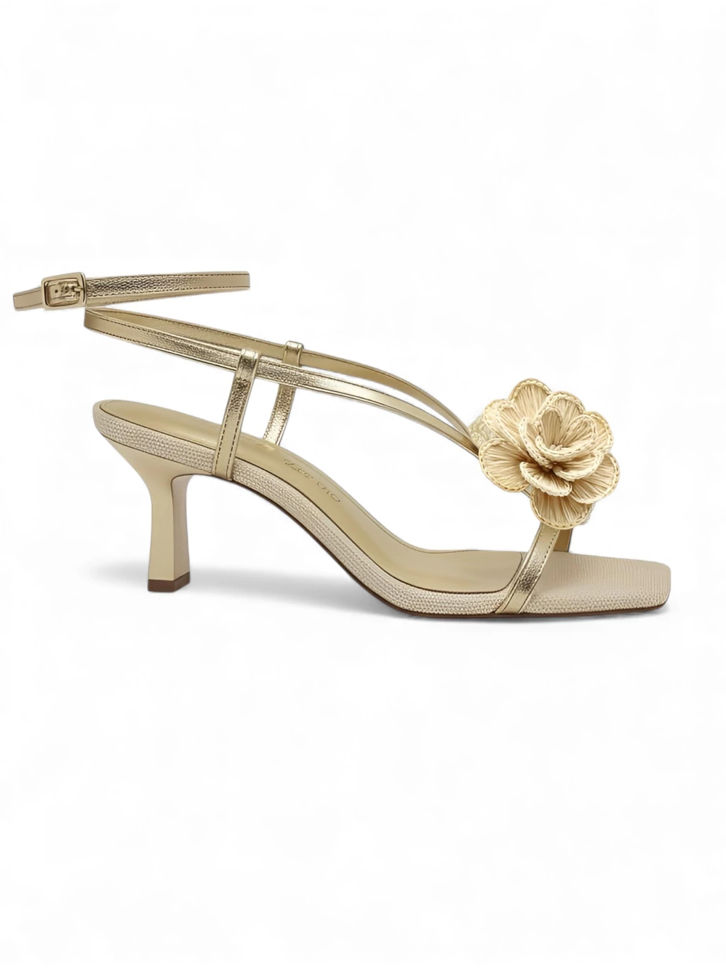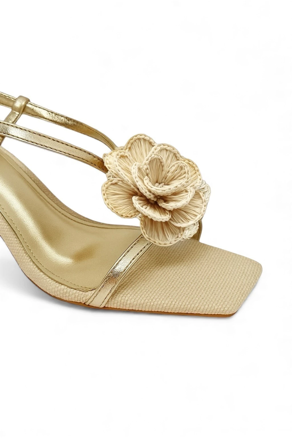 Sandália em material sintético dourado claro metalizado. Com acabamento texturizado em linho na palmilha, refletindo charme e sofisticação. Com tiras finas que envolvem o pé, o destaque fica pela flor de ráfia aplicada na parte superior. Possui bico quadrado e salto de 7cm.