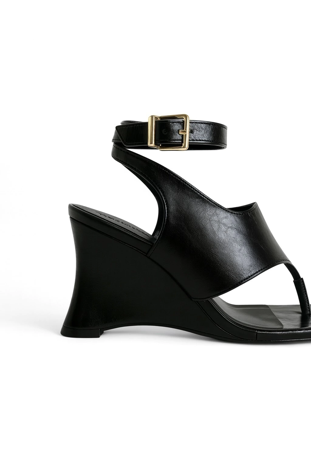 Sandália em couro sintético. Possui salto anabela curvo de 9cm e formato quadrado na ponta. Traz tira larga dividindo os dedos, em formato triangular, que cobre parcialmente a parte superior do pé até as laterais. Possui tira fina que sai das laterais, cruza no calcanhar, contorna o tornozelo e fecha em fivela lateral.