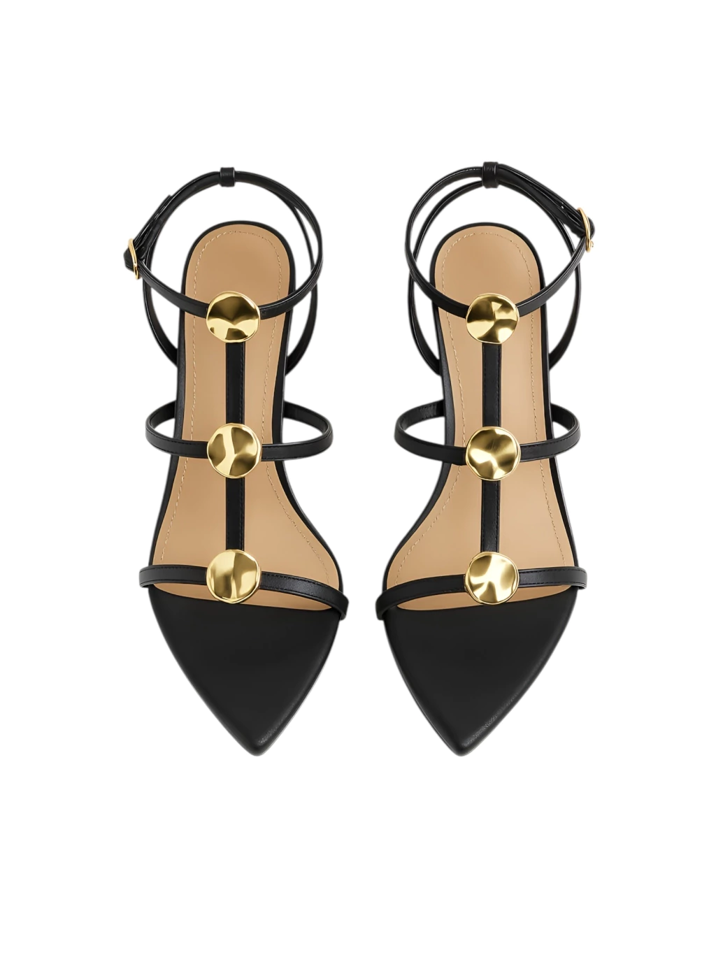 Sandália preta em material sintético, possui tiras finas com aplicação de 3 peças douradas em formato orgânico, que adicionam brilho e sofisticação à sandália. Possui bico fino e salto médio de 7,5cm.