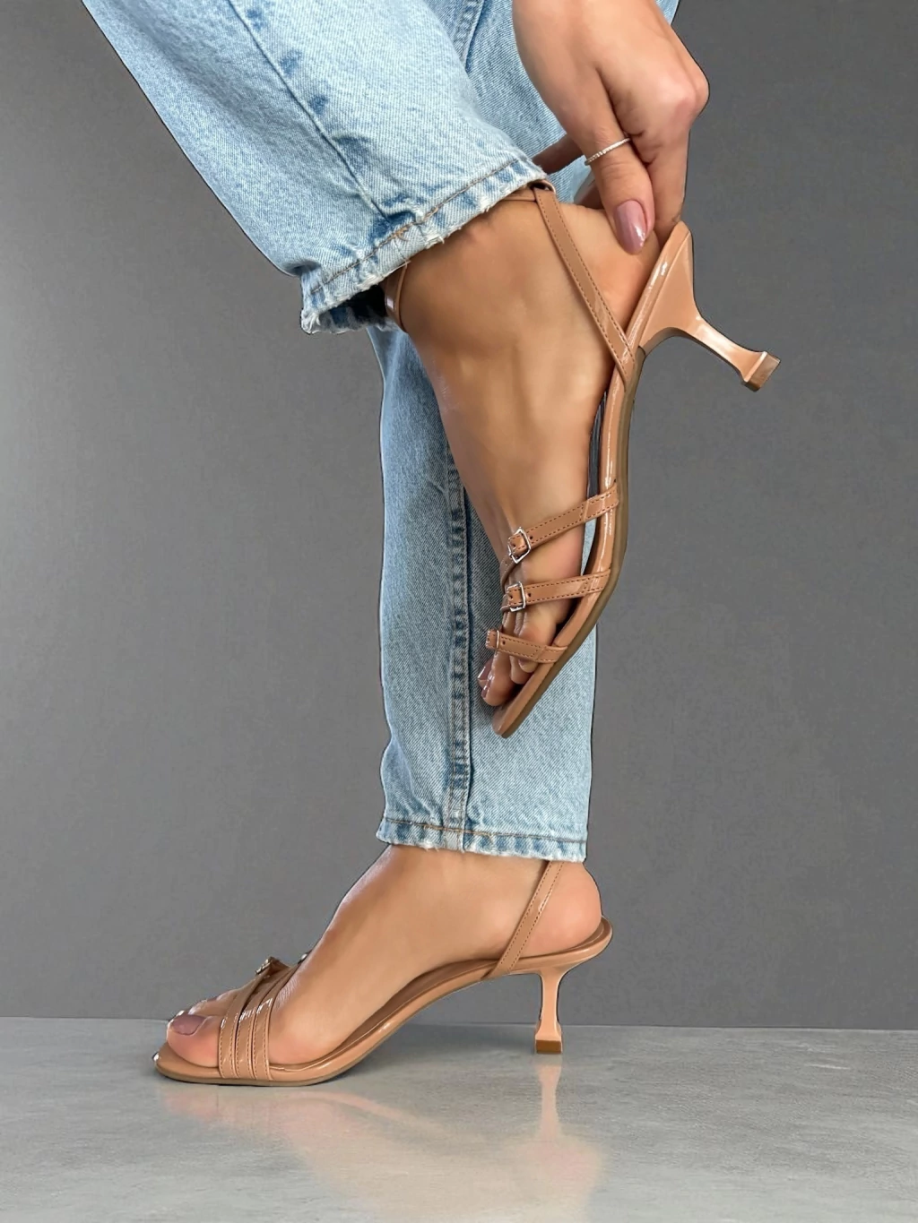 Sandália Verniz Salto Médio Tiras Fivelas Nude