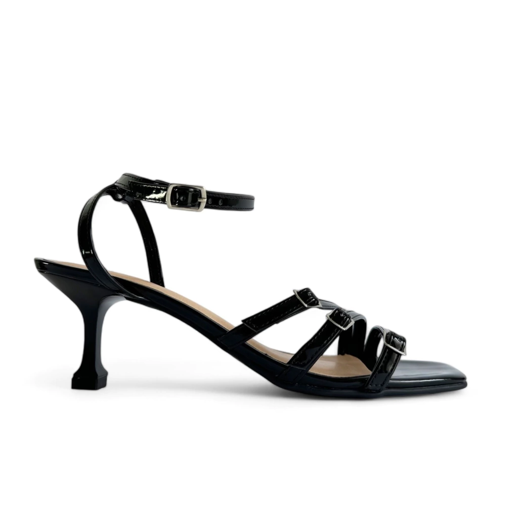 Sandália Verniz Salto Médio Tiras Fivelas Preta