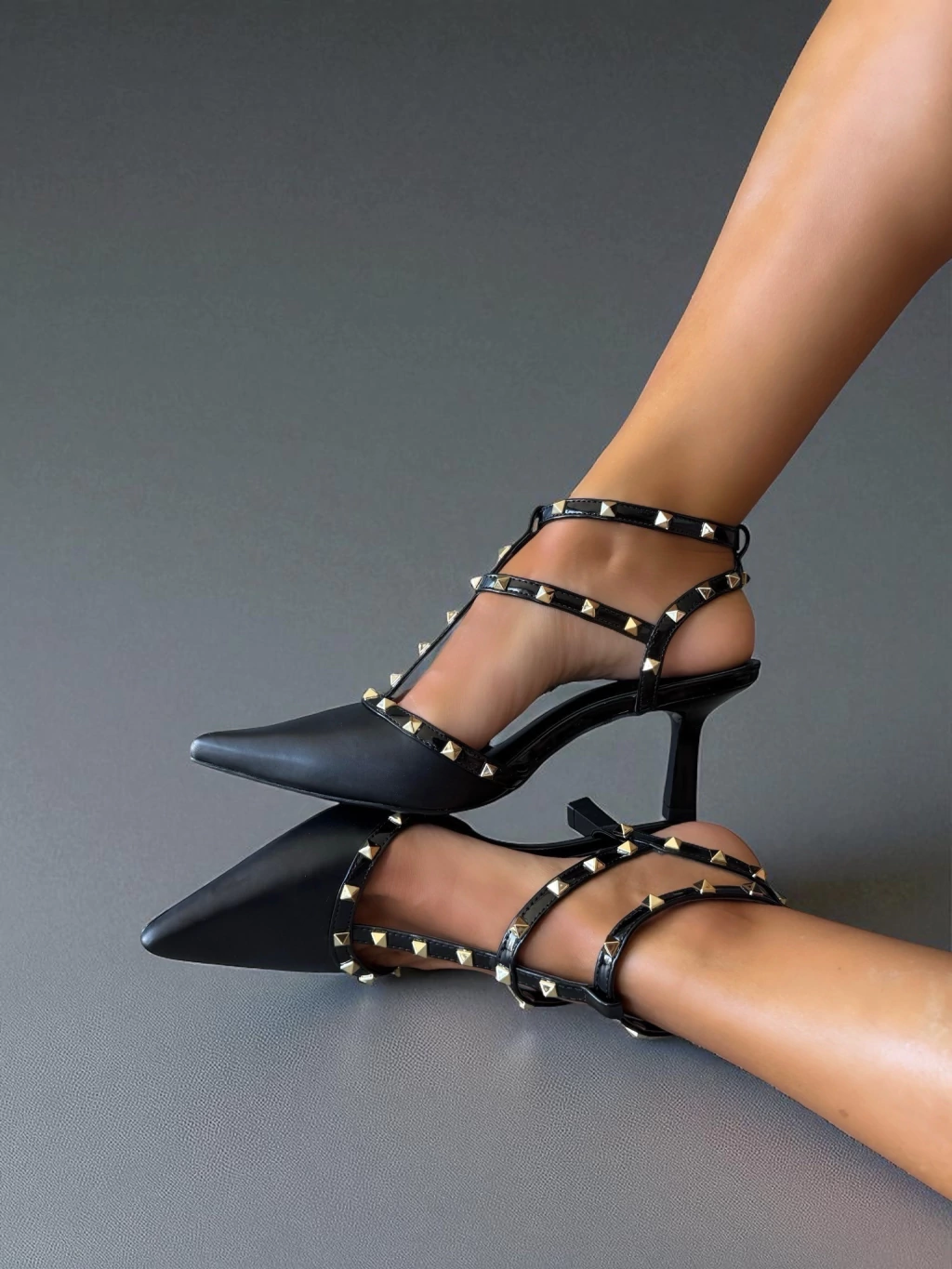 O scarpin em material sintético é a escolha perfeita para quem busca elegância e conforto. Com tiras em verniz e aplicações de tachas piramidais douradas, ele adiciona um toque de sofisticação ao seu visual.