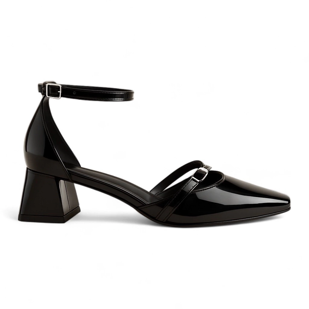 Scarpin preto em verniz, material sintético de alta qualidade. O sapato tem salto baixo bloco, ponta quadrada e fechado no calcanhar. Tem tira no tornozelo que fecha em fivela metálica lateral e uma tira sobre o pé.