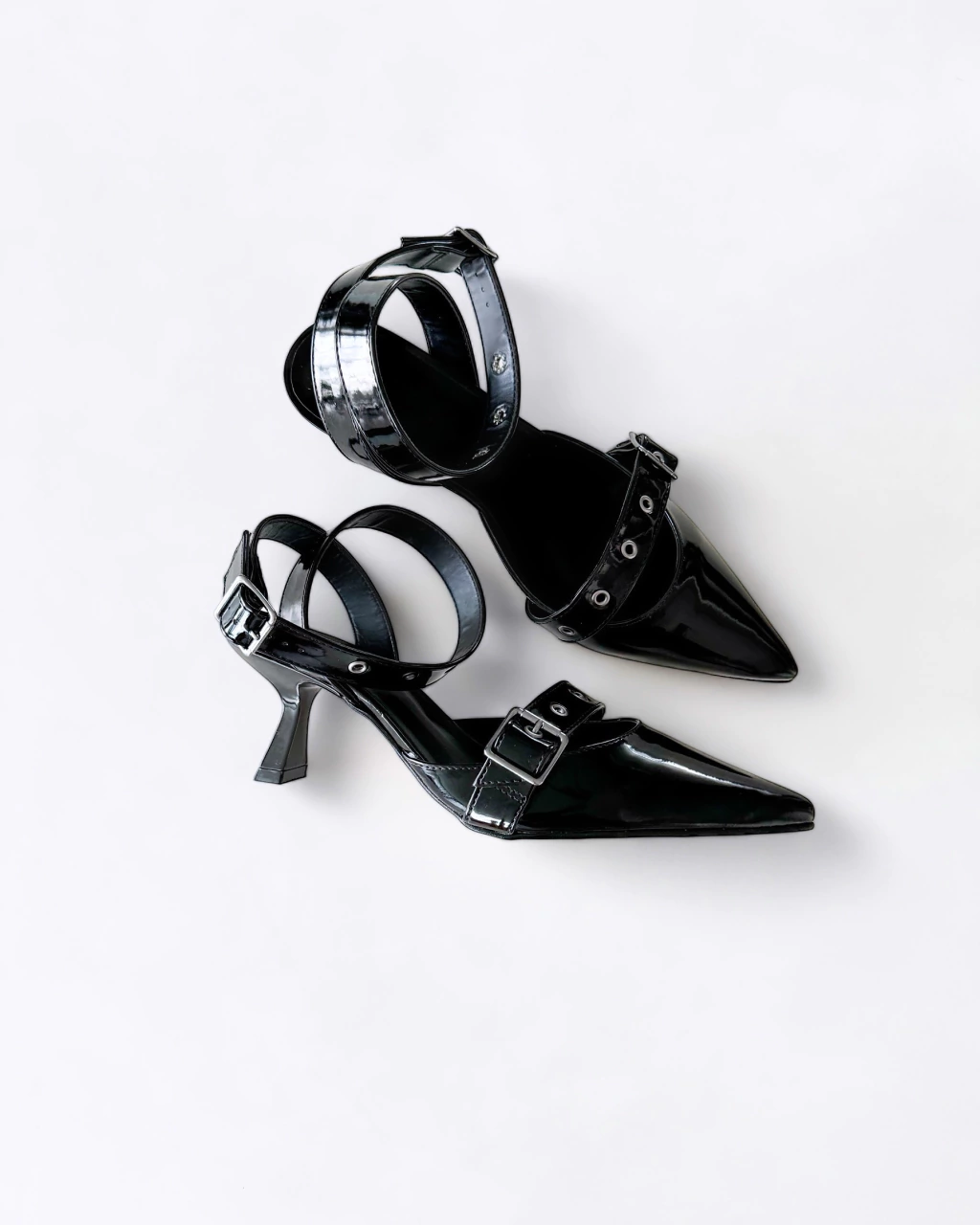 Possui uma tira na parte superior do pé com fivela metálica e aplicação de ilhós