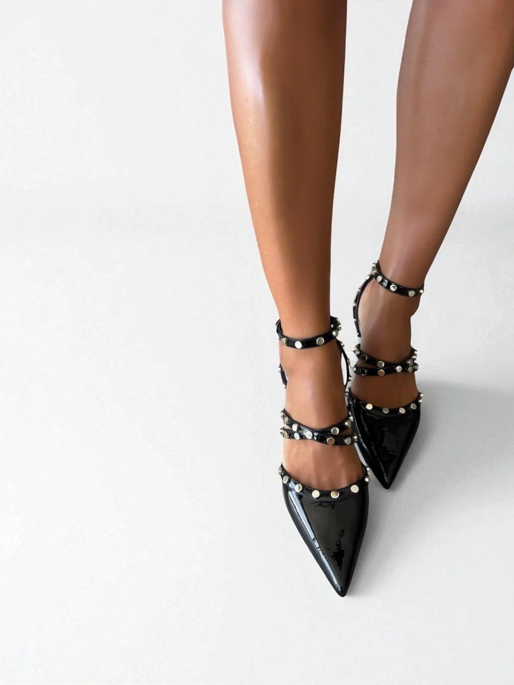 O design com bico fino e tiras finas cruzadas sobre os pés proporciona um ajuste perfeito, enquanto a tira fina ao redor do tornozelo, com fechamento por fivela ajustável, garante segurança e estilo. As aplicações de tachas douradas no cabedal acrescentam um toque sofisticado ao look.
