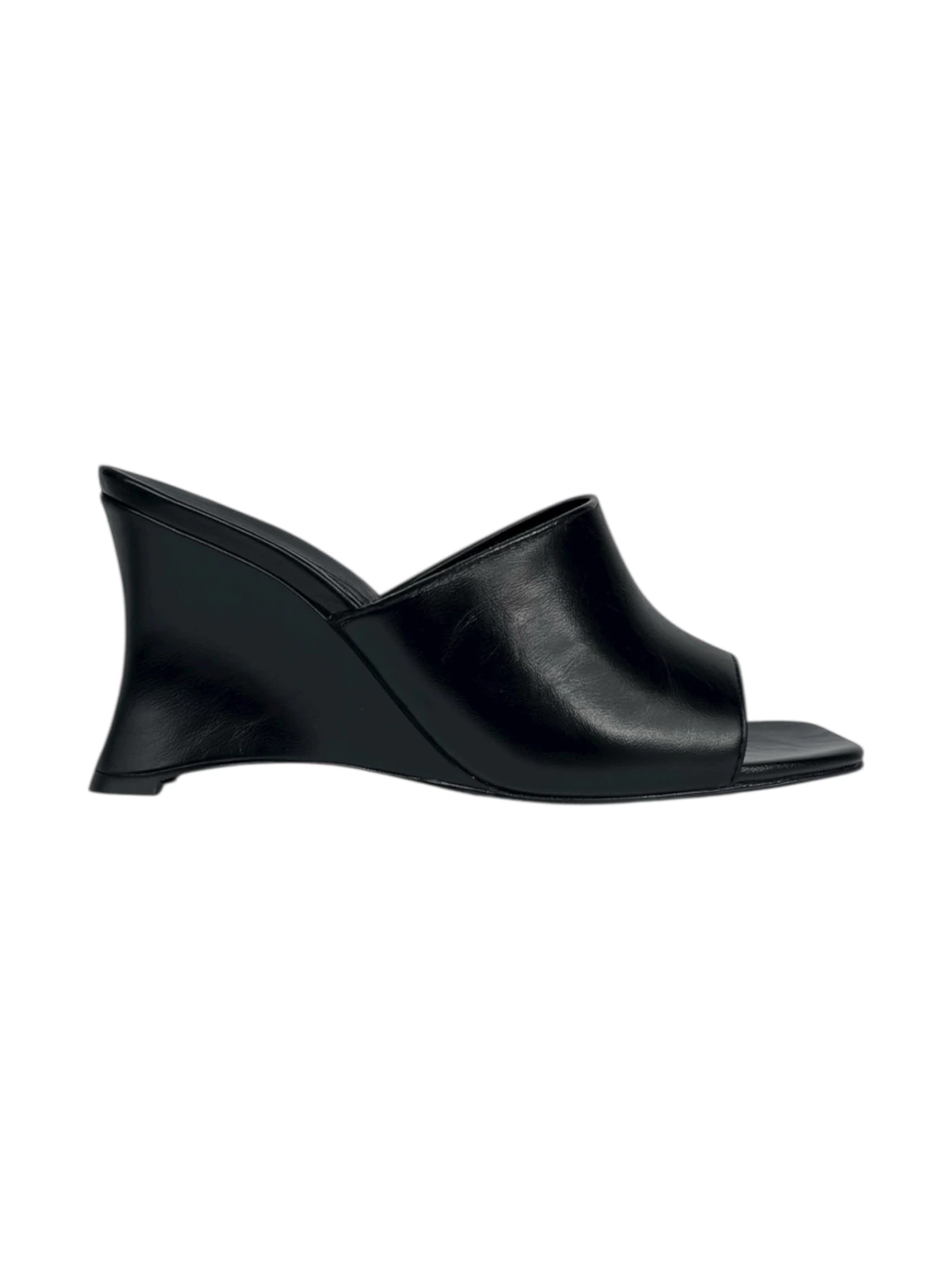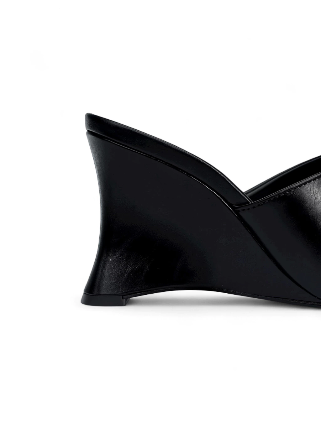 O tamanco tem salto anabela curvo de 9cm e formato quadrado na ponta. Traz tira única sobre os dedos e que cobre a parte superior do pé. Material em couro sintético.