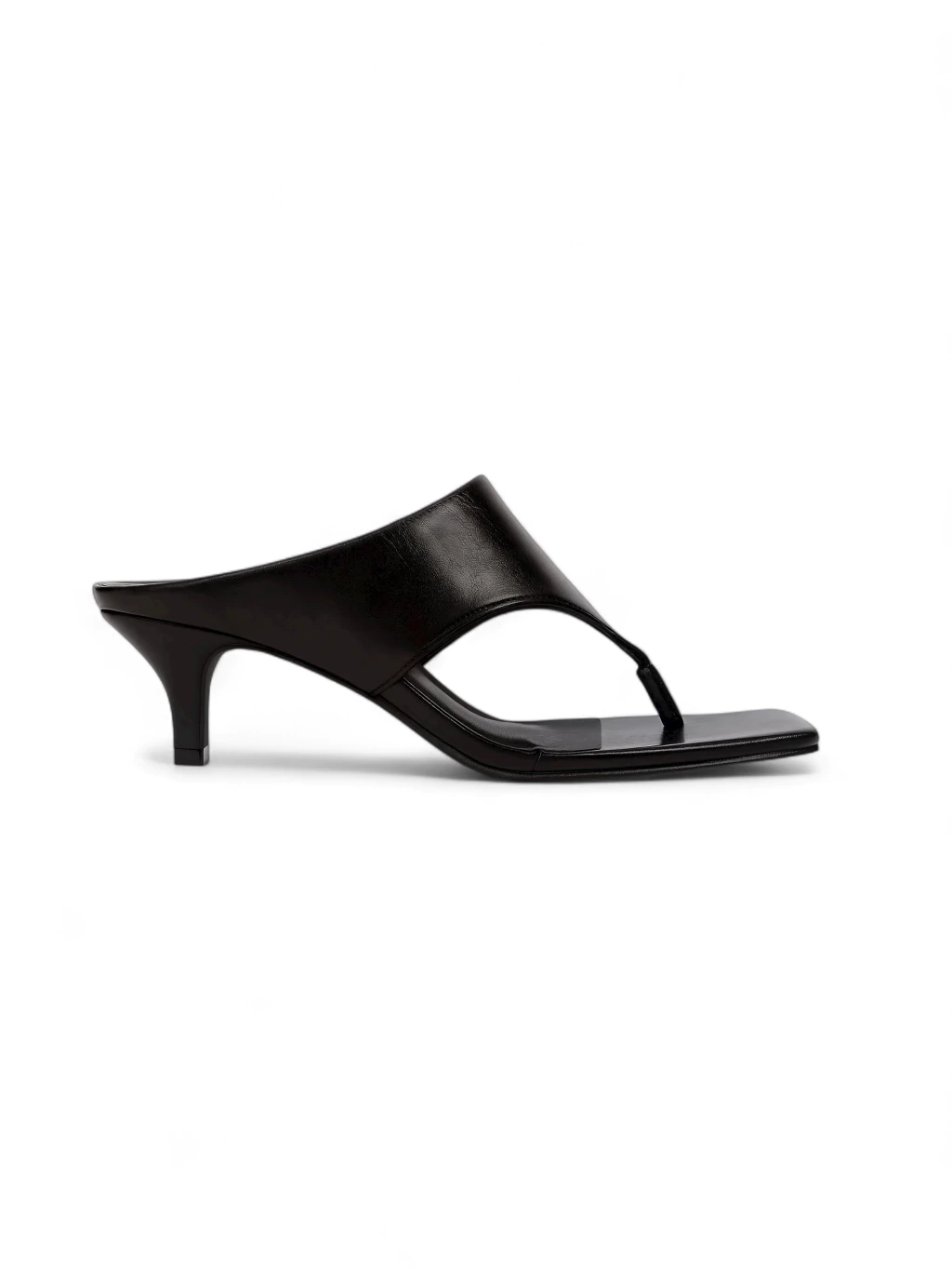 Tamanco preto em couro sintético. Possui salto baixo fino (kitten) de 5cm e formato quadrado na ponta. Traz tira larga dividindo os dedos, em formato triangular, que cobre parcialmente a parte superior do pé até as laterais.